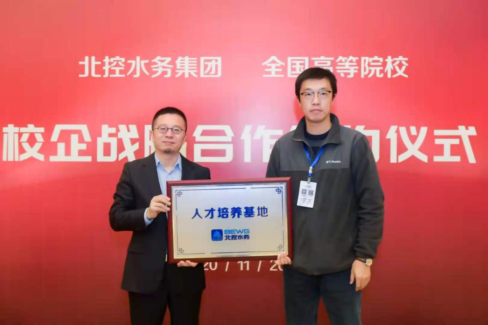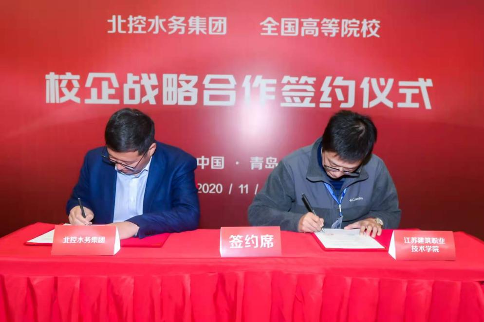 11月20日下午,江苏uwin电竞技术学院与北控水务集团双方校企合作暨授牌签约仪式在山东青岛举行。北控水务集团高级副总裁、北控水务学院院长于立国、北控水务集团总裁助理、东部大区总经理于良法、人力资源中心副总经理、北控水务学院副院长冀广鹏等,以及来自全国13所高等院校的代表共同参加了签约仪式,我院副院长袁涛、教授张宝军受邀出席签约。