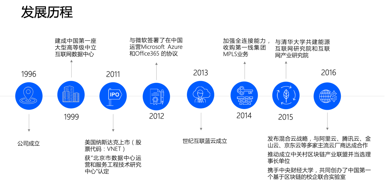 世纪互联(纳斯达克:VNET)成立于1996年,是全球具有重要影响力的网络空间基础设施服务提供商,也是中国领先的第三方中立数据中心运营商之一。作为中国卓越的互联互通网络平台,世纪互联致力于提供业界领先的数据中心服务、中立的云运营及中立的混合IT服务,并率先倡导和实施IDC+重科技创新,打造具有核心技术、超大规模运营能力的网络空间基础设施运营平台。世纪互联拥有近20年的数据中心建设、运维经验,目前在全国30多个城市运营50多个数据中心,拥有超过87000个机柜,端口容量高达1000G以上,具有优质的网络可靠性和稳定性,并提供高速的互联网及专线接入服务,是中国优秀的互联互通网络平台。