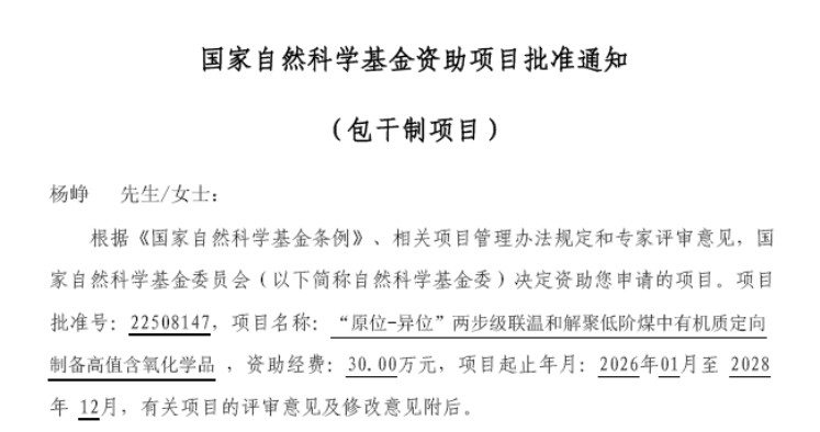 8月27日,国家自然科学基金委公布2025年度评审结果,学院杨峥博士申请的《“原位-异位”两步级联温和解聚低阶煤中有机质定向制备高值含氧化学品》项目,成功获批国家自然科学基金青年科学基金项目立项资助(项目批准号:22508147;资助经费30万元)。